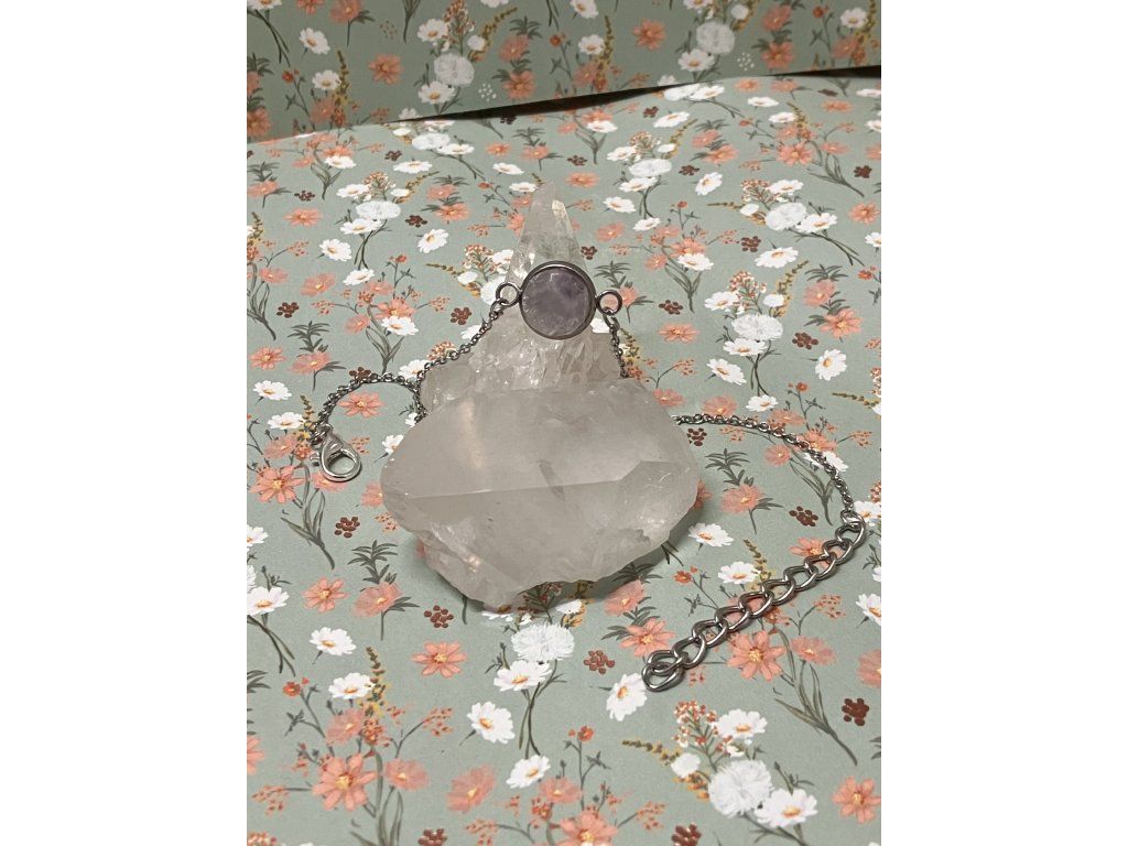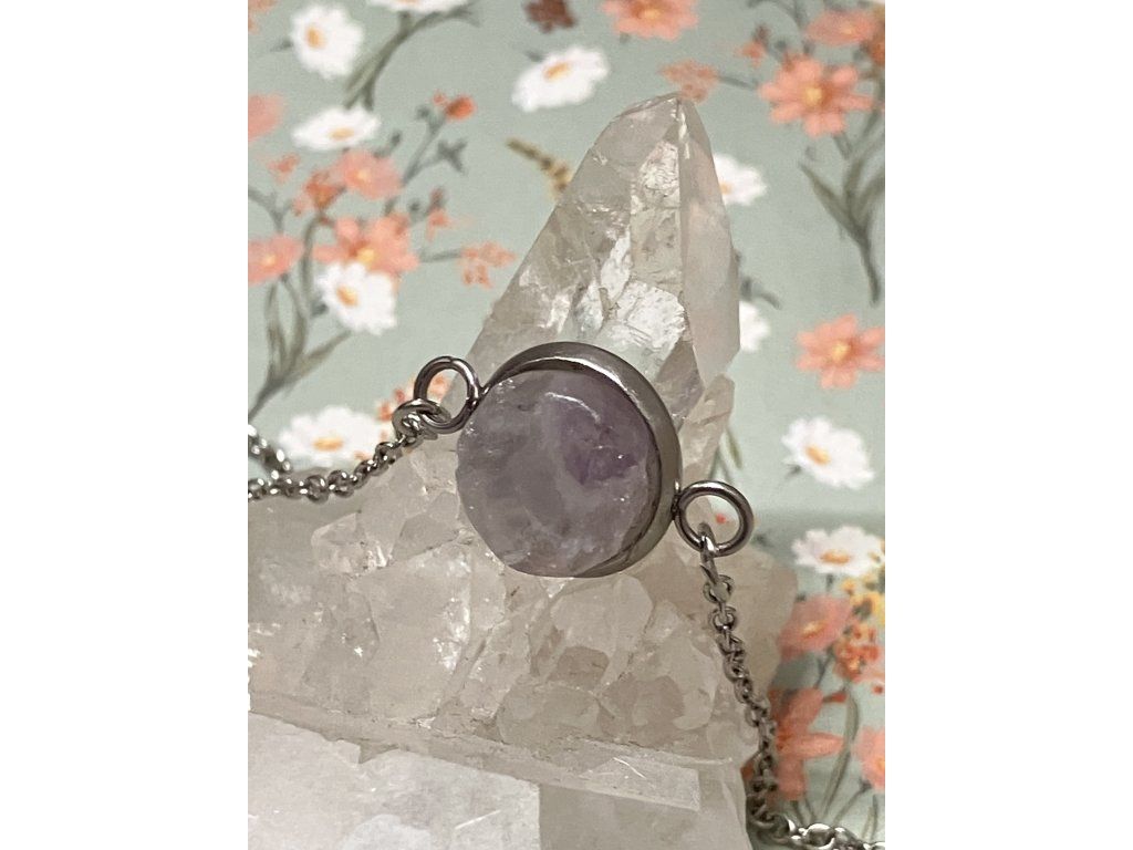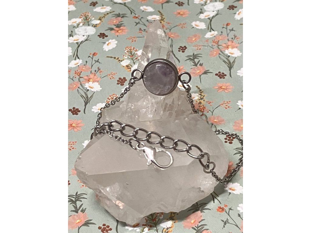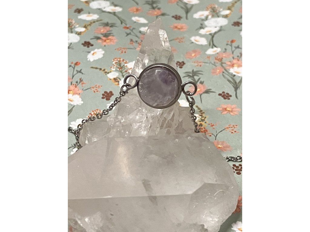 Tento ručně tvořený náramek nese energii klidu, ochrany a vnitřní rovnováhy. Ametyst byl nalezen v oblasti Klášterecké Jeseně, šetrně očištěn a vsazen do lůžka s povrchovou úpravou rhodiem, doplněný řetízkem z nerezové oceli. Vznikl tak šperk, který jemně, ale stabilně podporuje návrat k sobě.
