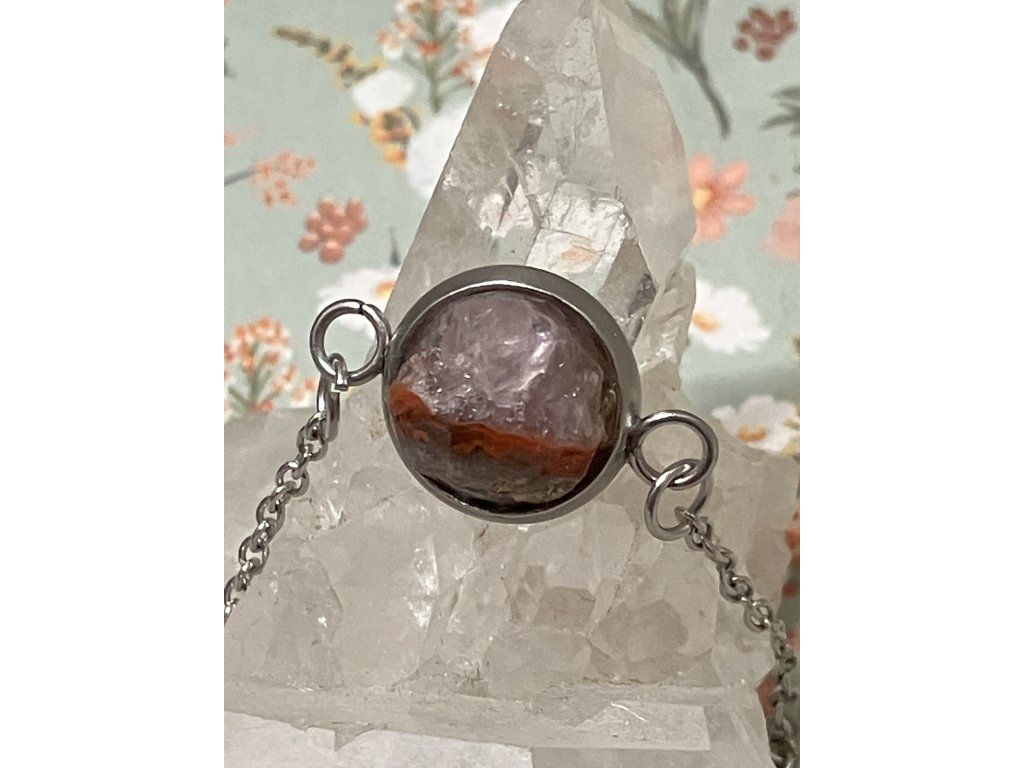 Tento ručně tvořený náramek v sobě spojuje klidnou, ochrannou energii ametystu s uzemňující silou achátu. Kameny byly nalezeny v oblasti Klášterecké Jeseně, šetrně očištěny a vsazeny do lůžka s povrchovou úpravou rhodiem, doplněné řetízkem z nerezové oceli. Vznikl tak šperk, který propojuje jemnost s pevností a podporuje vnitřní stabilitu.