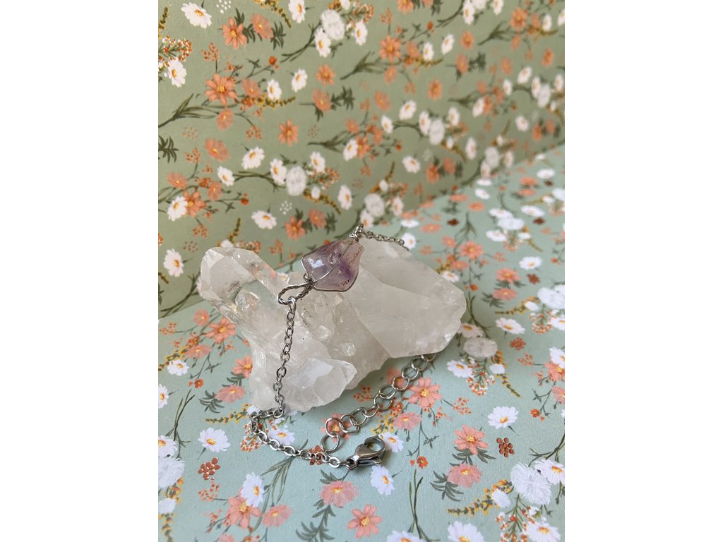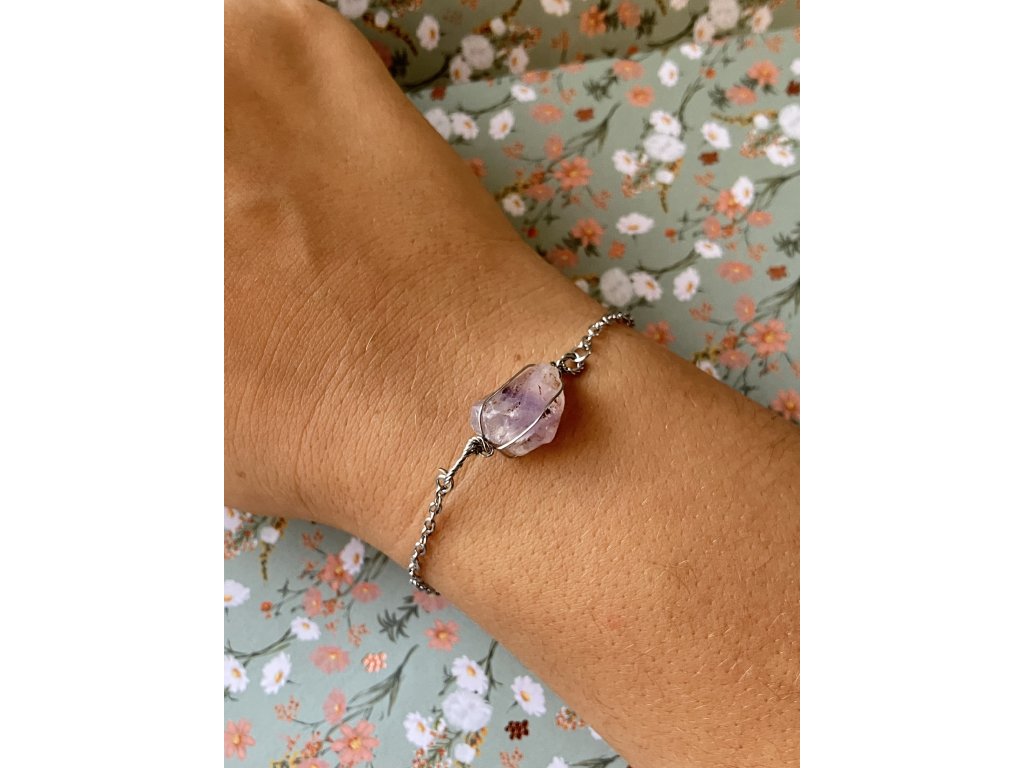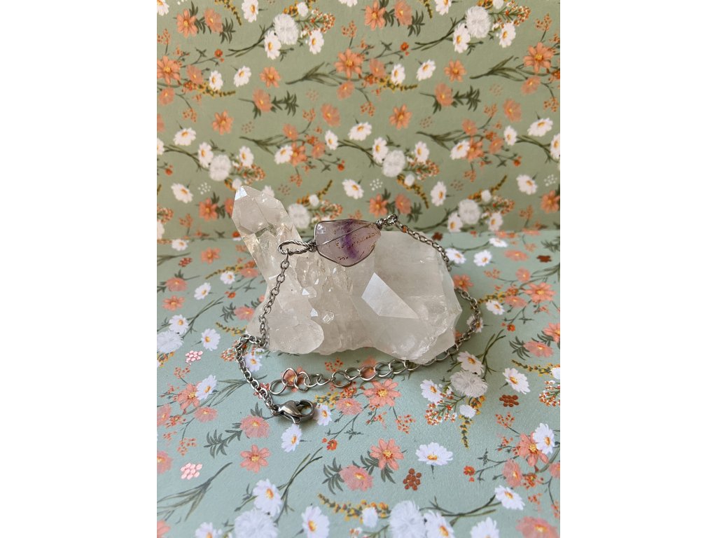 Ručně broušený ametyst z Horní Halže, jemně obmotaný nerezovým drátkem a přichycený k řetízku z hypoalergenní nerezové oceli. Náramek, který spojuje krásu přírodního kamene s lehkostí a odolností kovu. Tichý spojenec pro dny, kdy chceš být v souladu sama se sebou.