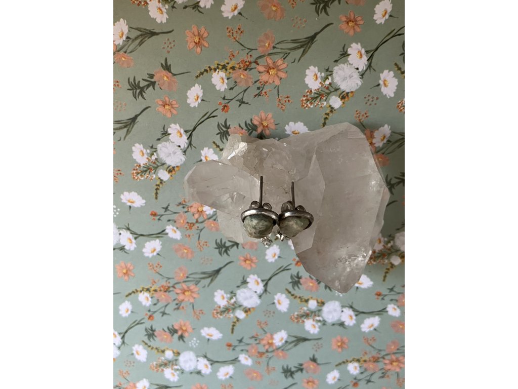 Tyto jemné náušnice nesou v sobě energii čistoty a klidu, kterou v sobě fluorit přirozeně nese. Kámen jsem osobně nalezla v Blahuňově u Chomutova, ručně vybrousila a vsadila do minimalistického designu z hypoalergenní nerezové oceli.