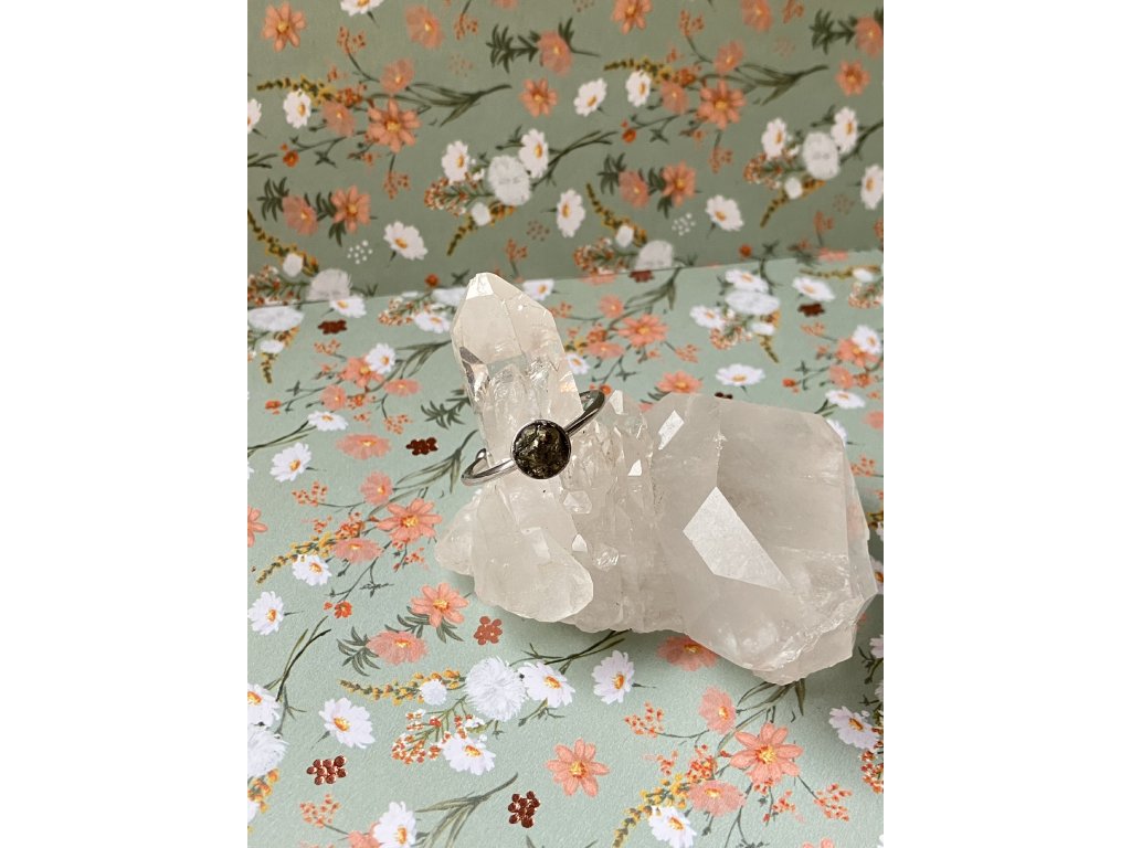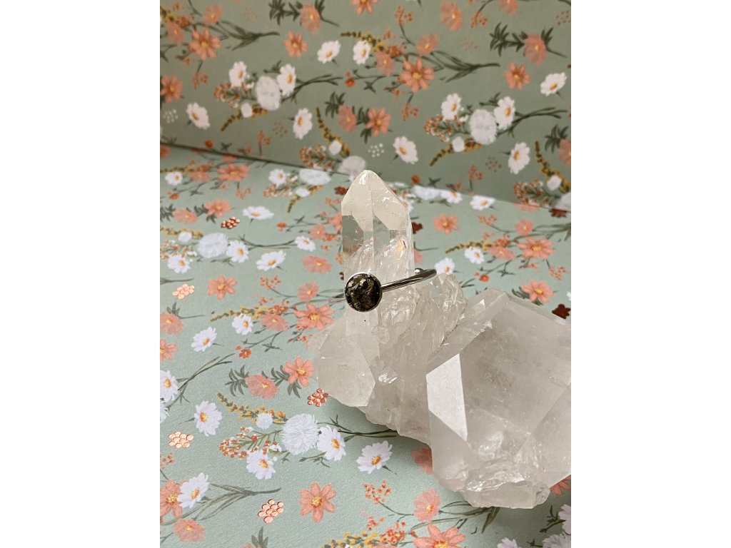 Ručně vytvořený prsten s přírodním pyritem z Měděnce, vsazený do hypoalergenní nerezové oceli. Šperk pro odvahu, energii a ochranu v každodenním životě.