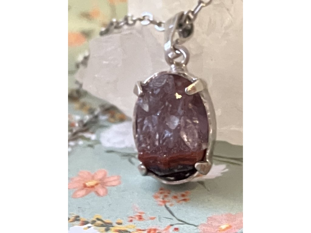 Ametyst s achátem byl ručně očištěn, jemně broušen a zasazen do rhodiovaného lůžka, které podtrhuje jeho přírodní krásu. Řetízek z nerezové oceli je hypoalergenní, odolný a vhodný pro každodenní nošení.